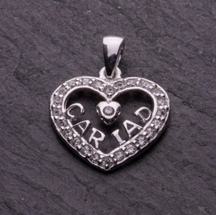 - Sterling silver cariad word (Welsh for love) surrounded by a patterned heart.