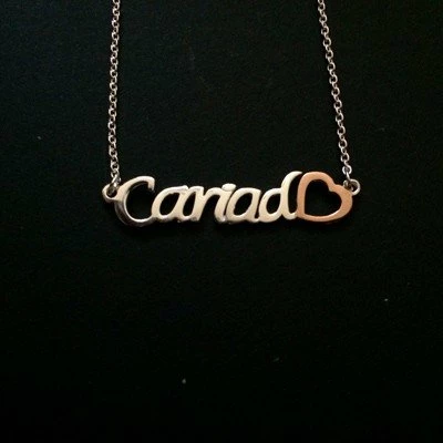 - Sterling silver cariad (Welsh for love) with rose gold.