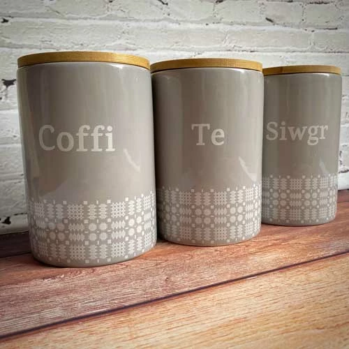 - Set of three neutral grey Welsh language kitchen containers for tea, coffee and sugar