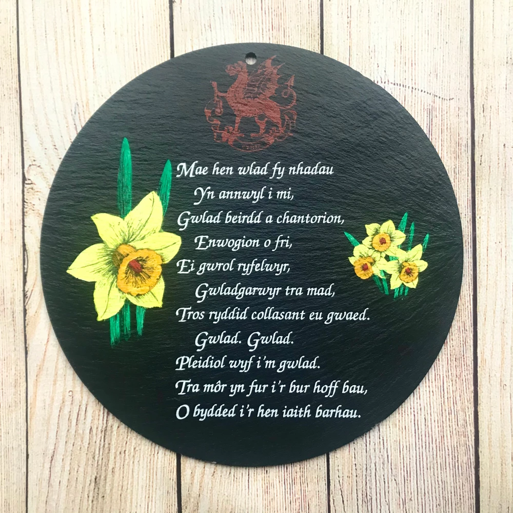 Welsh slate national anthem plaque with decorative Welsh dragon and daffodils.