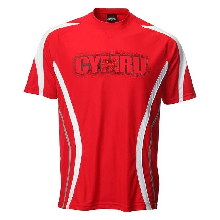 - Red t-shirt with Cymru print and embroidered Welsh dragon in centre.