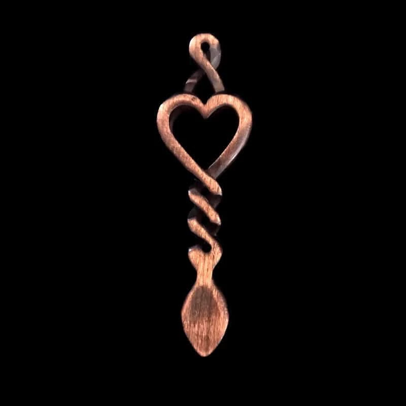 - Welsh love spoon with heart, crossed hook and braided pattern on handle.